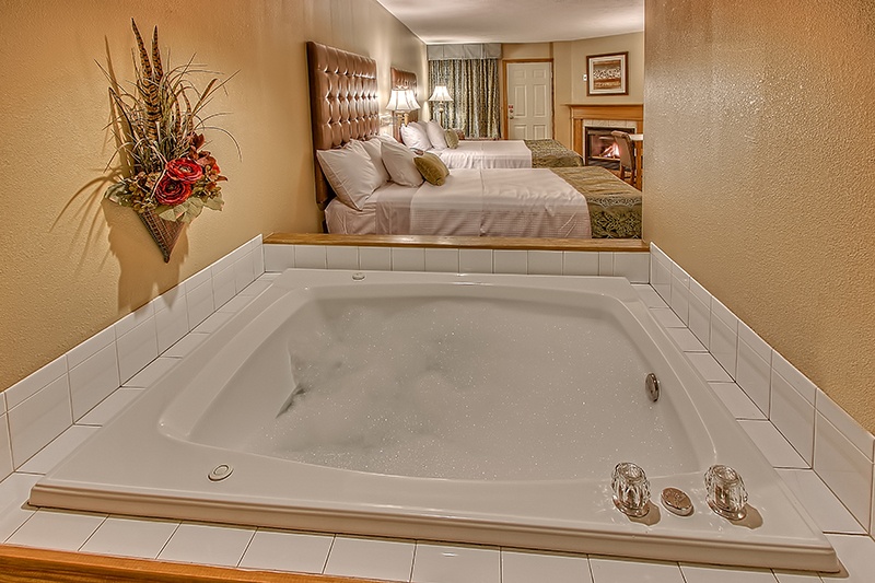 Jacuzzi tub filled with bubbles and two queen beds with fireplace at Pigeon Forge hotel