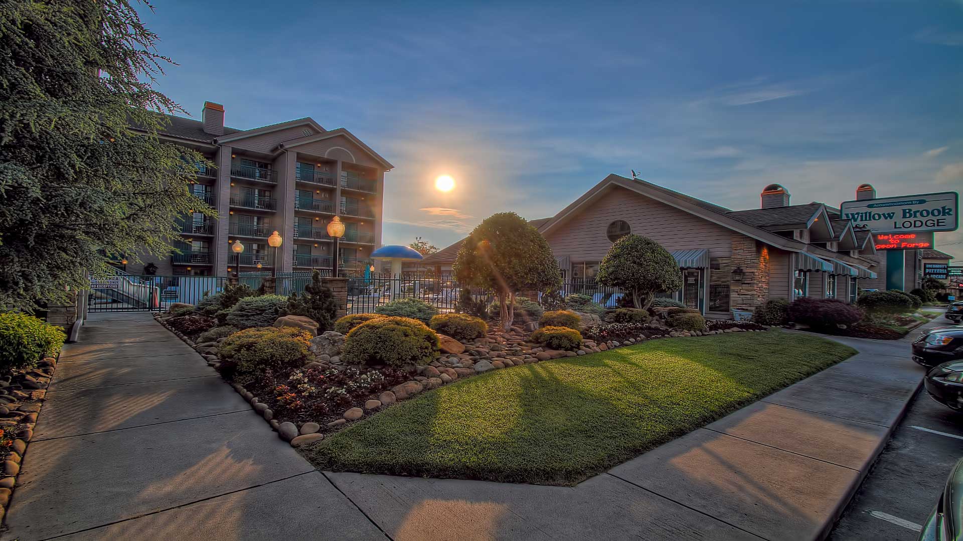 sun rising over Willow Brook Lodge in Pigeon Forge TN
